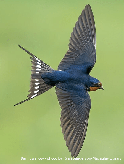 Barn Swallows: Identified by their long, deeply forked tail that streams out behind this graceful acrobat, you’ll find these tiny birds feeding on insects above meadows and fields as well as over water. Keep an eye out for mud puddles as they use mud and grass to build their cup-shaped nests, mostly on human-made structures such as barns, stables or under bridges. Mid-March