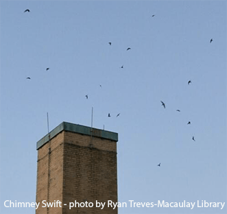 Chimney Swift: The only swift in the eastern US, this spring arrival is often seen in small groups, twittering and flitting across the sky in search of insects. Nesting and roosting in chimneys, these tiny aviators fly all day long with incredibly fast and snappy wingbeats. Their body is dark gray with a slightly paler throat and their blunt head, squared-off tail, and long, sickle-shaped wings make them distinctive. Late March
