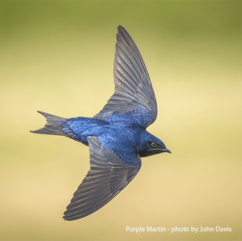 Purple Martin: The largest in the swallow family, this colony-nesting species is one of the earliest to return. The males are dark overall but with a distinctive purplish-blue iridescence visible at close range. The females of the species are grayer with iridescence on the crown and back. If you provide a nesting box, you may just be lucky enough to attract a pair. Early March