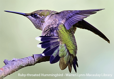 Ruby-throated Hummingbird: You’ll find this small hummingbird in woodland and brushy habitats, however, they are readily seen at sugar water feeders and in flower gardens. The male has a distinctive ruby-red throat and black chin. The female has whitish underparts with almost no buffy tones, but with perhaps a light wash on her flanks. Getting a photo of these tiny birds, sometimes mistaken for large insects, can be very tricky as they are very quick flyers and rarely sit still. Early April